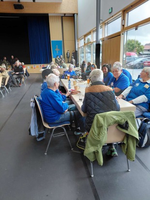 Gegen 14:00 Uhr erreichten alle Wanderfreunde müde, aber zufrieden wieder die Halle. Dort war bestens für das leibliche Wohl gesorgt. Unter anderem gab es leckere Currywürste mit Pommes und kühle Biere. Ein Alleinunterhalter sorgte in der Halle für gute Stimmung und stimmte für die Wanderfreunde „O du schöner Westerwald” an.